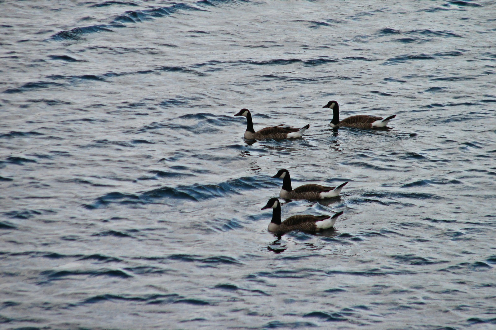 Okay, yesterday I said that I didn’t have any more Canada Geese shots, but when I looked through some photos I had sorted out to reprocess, I found two nice long-distance shots. This is one of them, from June 2009 – a somewhat moody photo of three Geese in some rough waters on the river.
