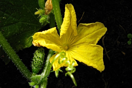 A cucumber blossom, with the product underway in the background.