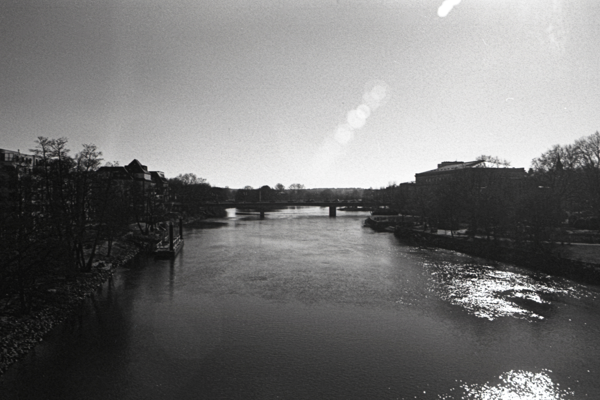 The view from Mülheim’s old railway bridge towards the Schloßbrücke in 1960s style on Fomapan Film.