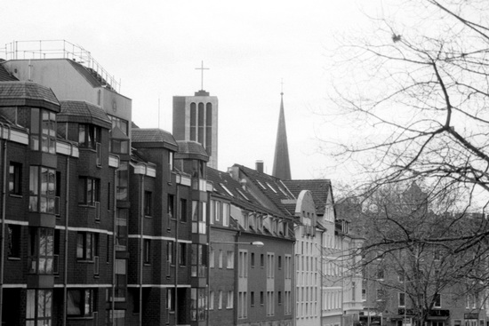 Church towers peeking over the houses on Mülheim’s Dickswall.